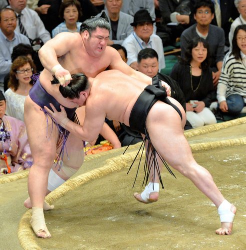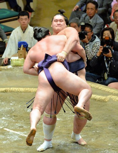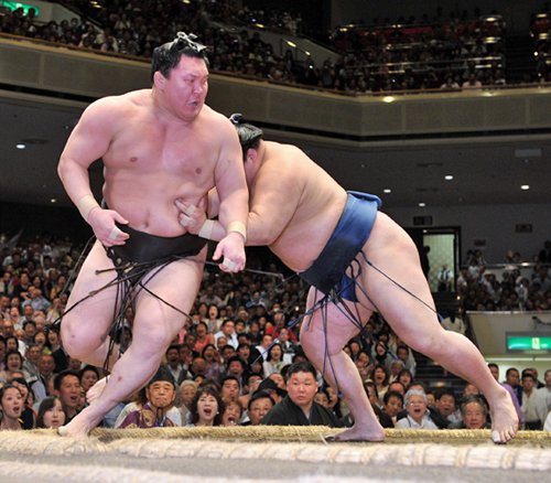 Tout allait parfaitement pour Hakuhô jusqu’à aujourd’hui où en un instant la rencontre qui l’opposait au sekiwake Gôeidô ne prenne une autre tournure. Après un bon tachi ai, le yokozuna a été déséquilibré se retrouvant un cours instant le dos à son adversaire qui en a profité pour infliger à Hakuhô sa première défaite du tournoi. Tout est allé très vite comme c’est souvent le cas dans le sumo mais il était déjà trop tard, Hakuhô perd la tête du peloton et doit désormais partager sa place de leader avec Kisenosato.