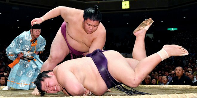 Endo got a right-handed grip on Kisenosato’s belt but could not hold on and the ozeki turned the tables to floor him with a kotenage armlock throw.