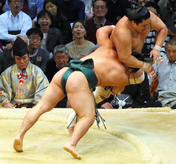 For an instant, Kakuryu appeared set for his 11th win. With a left-handed underarm hold on the ozeki’s belt, the yokozuna attempted a throw. But it was poorly executed. Kakuryu’s grip slipped and Kisenosato quickly finished the yokozuna off with an armlock throw.