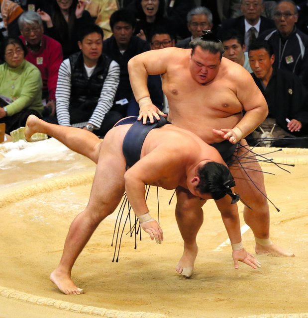 Terunofuji looked for an opening, but Goeido, who entered the tournament aiming for yokozuna promotion, offered none and finished with a simple frontal forceout. It was Goeido’s 10th win in 13 career bouts with the Mongolian.