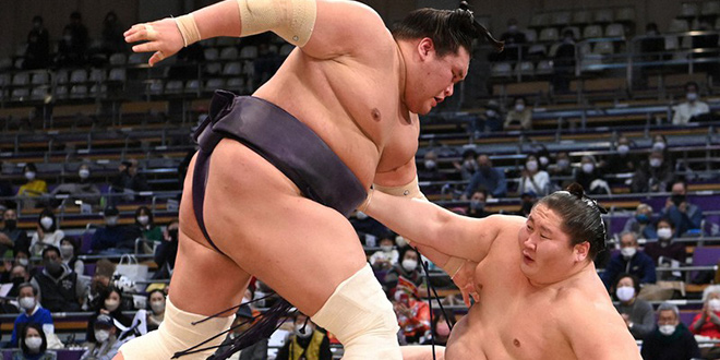 Hokutofuji (M8, 8-2) affrontait Chiyomaru (M15, 5-5), par la passé ces lutteurs se sont rencontrés 5 fois et Hokutofuji a chaque fois remporté la victoire, l’issue du combat paraissait être sans surprise possible…et ce fut le cas, Chiyomaru n’ayant à aucun moment la possibilité de mettre en danger son adversaire. Cette victoire positionne Hokutofuji à 9-2, une bien belle performance sur ce tournoi qui va, logiquement lui permettre de réintégrer le haut du classement des maegashira qu’il avait temporairement quitté.