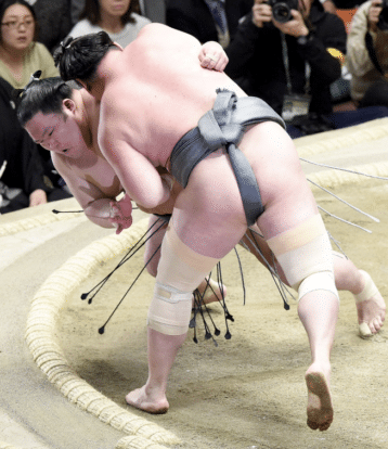 Le Géorgien de 177 kilos, qui a abandonné sa seule défaite à Kakuryu lors du Jour 7, a échangé de nombreuses poussées avec le maegashira No. 6 pendant vingt longues secondes avant d’être conduit au bord du cercle. Tandis que Takarafuji tentait d’en finir en enroulant ses bras autour du Géorgien pour le coup de grâce, Tochinoshin à fait basculer son adversaire pour éviter la défaite.