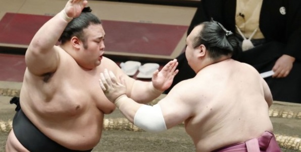 In other bouts, sekiwake Mitakeumi (7-4) plowed No. 6 Kagayaki (6-5) out of the ring, while Daieisho (4-7) easily shoved out No. 3 Terutsuyoshi (3-8).
