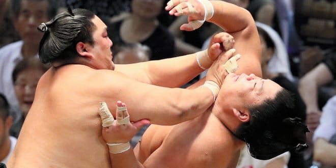 Mugged by Shohozan on Tuesday, Kisenosato bounced back at Aichi Prefectural Gymnasium but the Tagonoura ozeki had his work cut out for him against his fourth-ranked opponent.