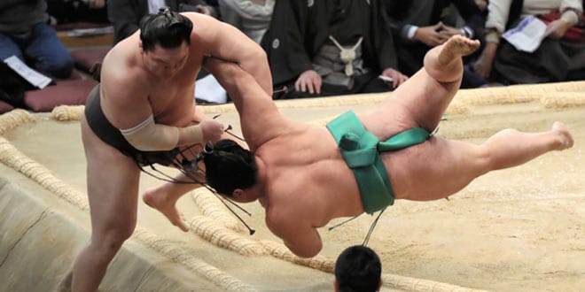 Third-ranked maegashira Hokutofuji (9-2) outmuscled ozeki Goeido (7-4) and put him on his backside to keep his title hopes alive, while No. 12 maegashira Okinoumi stayed in contention after forcing out same-ranked Kagayaki (6-5) in the day’s second makuuchi bout.