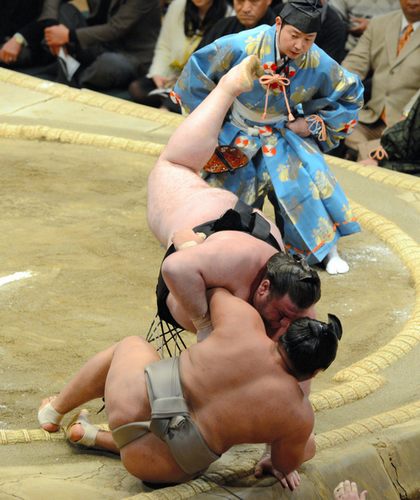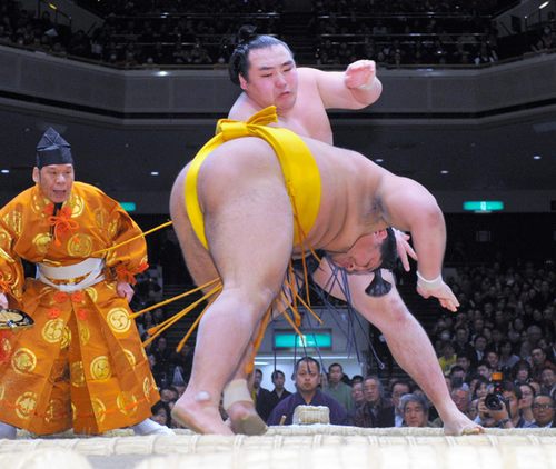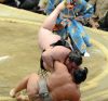 Satoyama (7-5) qui avait fait parler de lui en remportant son combat contre le lutteur le plus lourd de la division makuuchi lors de la dixième journée (lire l’article) a accompli une prise bien rare dans le sumo (et très spectaculaire) qui est le ipponzeoi lui accordant la victoire sur Tochinowaka (7-5). Consultez notre page sur les kimarite pour en savoir davantage sur le sujet.
