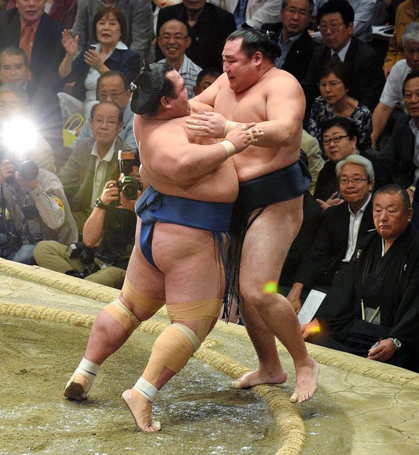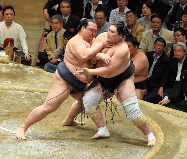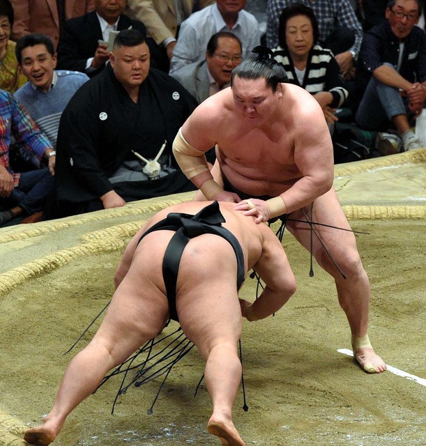 Yokozuna Harumafuji became the only wrestler with just two losses, getting hold of the front side of Kotoyuki’s (5-7) belt with his right hand and forced the sekiwake out. The popular sekiwake appeared to stumble going out and was propelled backward through the air to a crash landing among the spectators.