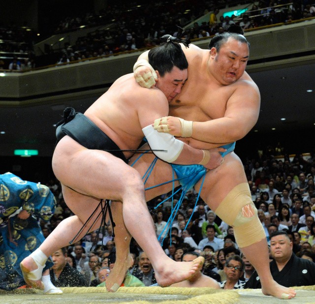 Kisenosato had a comfortable bout against injury-plagued Terunofuji (2-10), with a strong right-hand push to the throat of his fellow ozeki and easily ousting the Mongolian to his 10th straight defeat.