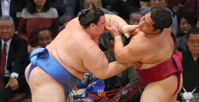 Hakuho improved to 12-0 after forcing out Fukuoka-born Kotoshogiku (7-5), scoring his 46th win in 50 meetings between the two at grand tournaments. Hakuho initially allowed Kotoshogiku to get hold of the right side of his belt but broke away to safely steering out the ozeki at Fukuoka Kokusai Center.