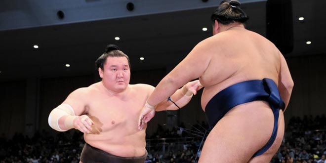 Hakuho s’est remis de sa défaite de la veille en battant Mitakeumi tandis que les deux ôzeki ont perdu face à des lutteurs moins bien classés.