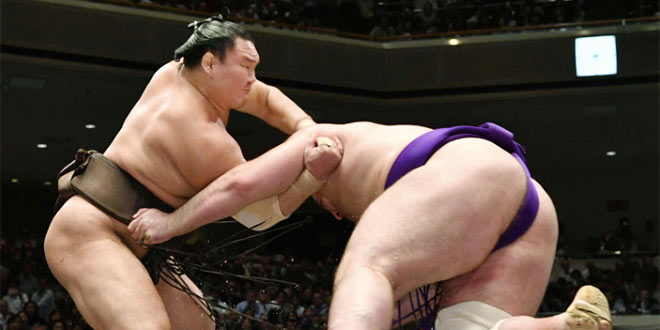 Le yokozuna a glissé son bras droit sous l’aisselle gauche de Tochinoshin puis a projeté le puissant géorgien à terre. Le Mongol maintient ainsi son avance de deux victoires.