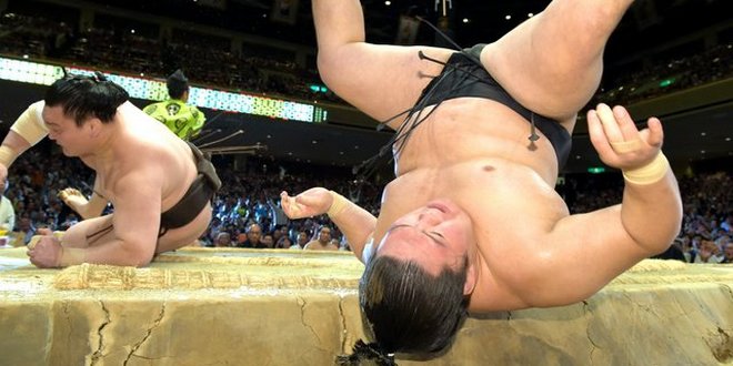 It was a bad day all around for sumo’s top rank as Harumafuji (8-4) was blasted into the ringside cushions by sekiwake Myogiryu (5-7).