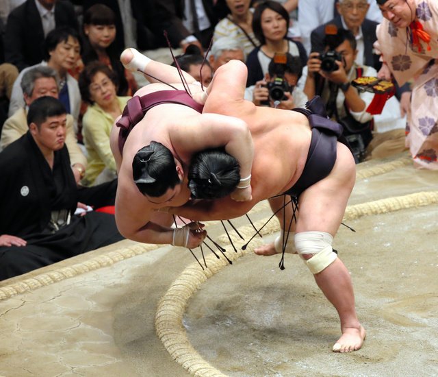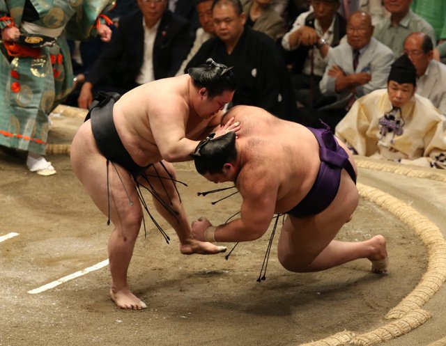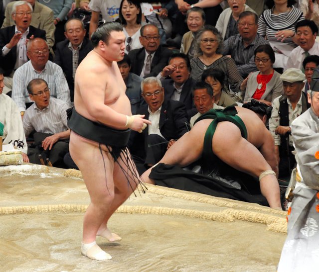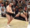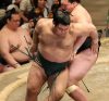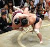 Harumafuji improved to 9-4 with a solid win over Kisenosato (9-4). The Mongolian grand champion tore in low at the charge and got his hand on the back of Kisenosato’s neck and slapped him to the sandy surface.