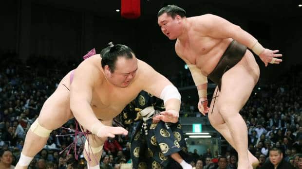 Hakuho (12-1), the lone yokozuna competing at the 15-day meet, twice came close to tasting defeat. After the initial charge, Hakuho tried to shove his opponent out of the ring, but Takarafuji dodged and the yokozuna was barely able to put on the brakes before stepping out at Fukuoka Kokusai Center.