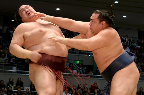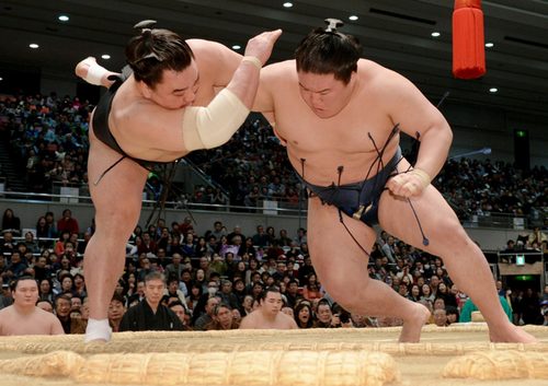 Harumafuji vient de subir se second échec d’affilé après avoir perdu hier contre Kakuryû.  Goeido a pu bénéficier du support inconditionnel d’une foule partisane qui l’a encouragé lors de son combat contre le yokozuna. Originaire d’Osaka, le sekiwake a vaincu Harumafuji par yoritaoshi.