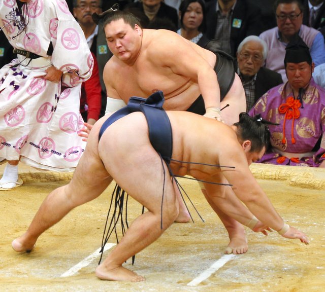In the day’s final bout, Kakuryu (8-5) lost his footing soon after the initial charge as Terunofuji improved to 7-6. Kakuryu forced his Mongolian compatriot upward on the charge and as he lowered his body to take aim at Terunofuji’s midsection, a slip of foot amid a hail of slaps from the ozeki saw the yokozuna crash to the surface.