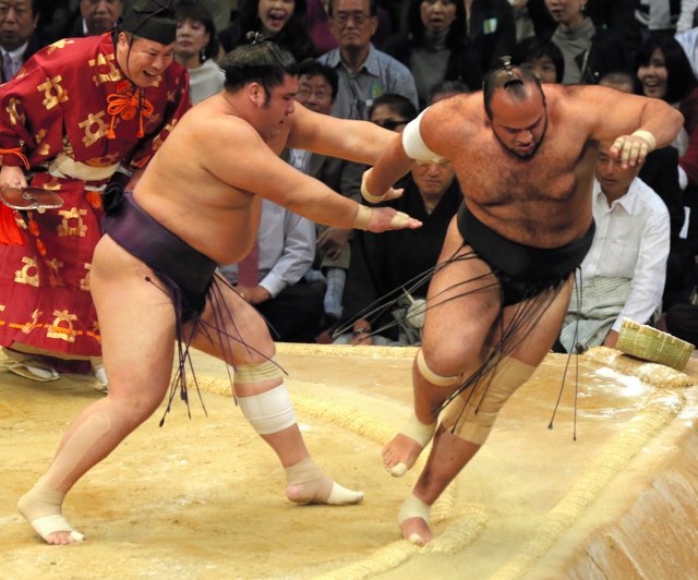 Hakuho qui cherche à étendre son record avec un 36ème titre a attaqué sur la gauche au moment de la charge mais Harumafuji a parfaitement anticipé la ruse de son compatriote. Harumafuji a bondi en se déportant sur le côté et est descendu sur le flanc droit exposé de Hakuho pour lui tourner autour. Sans perdre de temps, Harumafuji s’est penché vers son rival pour le saisir à l’arrière de son mawashi, conduisant de force Hakuho vers la sortie.