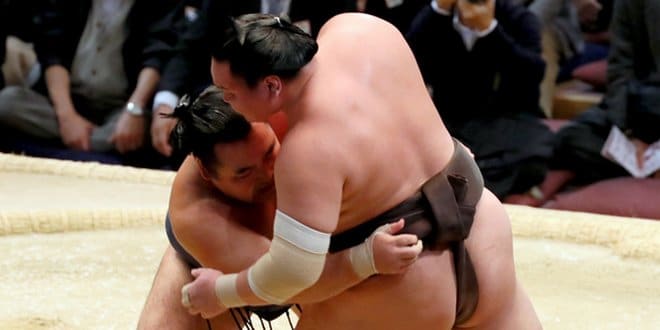 Dans les autres combats de la journée, le komusubi Tamawashi a battu l’ôzeki Terunofuji en le poussant par derrière et parvient à une majorité de victoires.