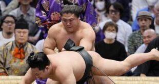 The other sekiwake wrestler, Mitakeumi, scraped out a vital sixth win in a rambunctious free for all with No. 6 maegashira Hokutofuji (6-7). Mitakeumi repeatedly tried to shove back and pull down his opponent and at one point was inches from being shoved out.