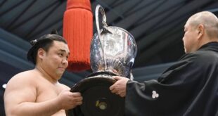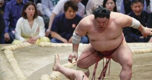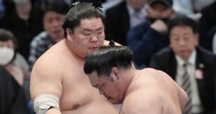Mais Mitakeumi, en compétition pour le cinquième grand tournoi d’affilée à son niveau actuel, s’est échappé, évitant d’être battu alors qu’il luttait pour garder ses pieds avant de frapper son adversaire pour finalement l’emporter.