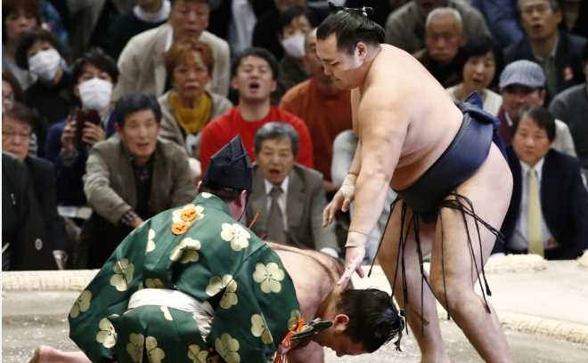 The other sekiwake wrestler, Mitakeumi, scraped out a vital sixth win in a rambunctious free for all with No. 6 maegashira Hokutofuji (6-7). Mitakeumi repeatedly tried to shove back and pull down his opponent and at one point was inches from being shoved out.