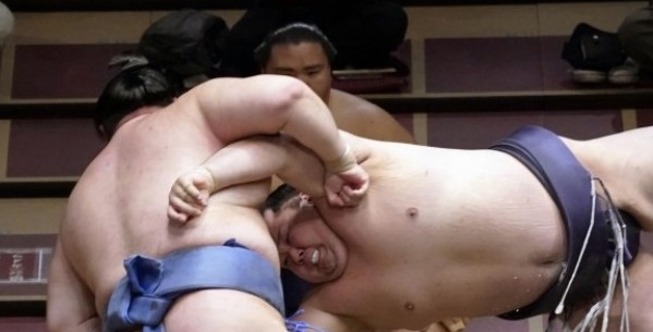 Okinoumi (M8) est devenu une proie facile pour son ennemi juré, le komusubi Ichinojo pour la septième fois en neuf combats en carrière. Le Mongol de 206 kilogrammes a enveloppé les bras d’Okinoumi sur la charge, l’a tordu vers le bord du dohyô et l’a forcé à sortir.