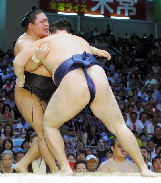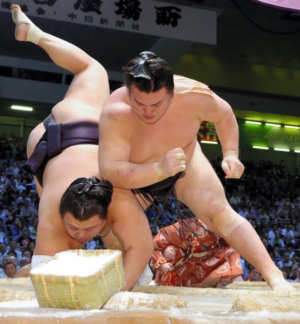 At ozeki, Terunofuji (11-3) continued his excellent start to life at sumo’s second-highest rank, the Mongolian prevailing in a slapfest before sending out fourth-ranked maegashira Takekaze (5-9) with a meaty neck thrust.
