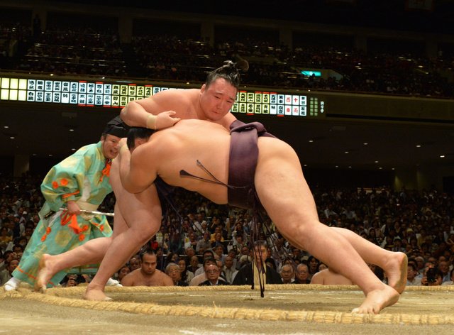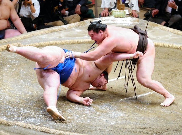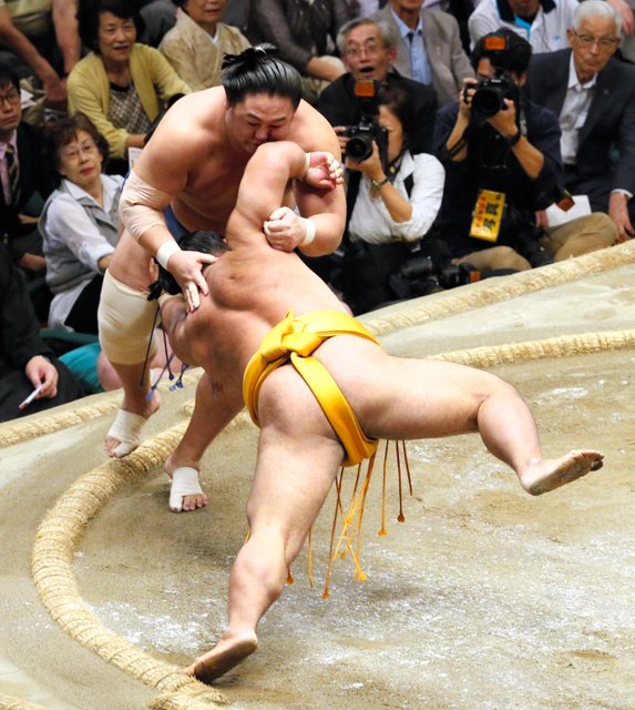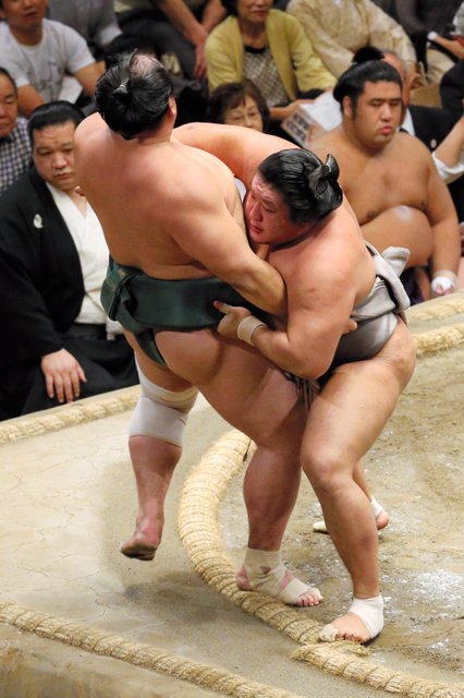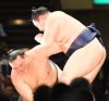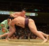 Kisenosato était stressé, sans doute trop car il a multiplié les faux départs face à Kakuryû. L’ôzeki tout juste kachi koshi réalise l’un de ses plus mauvais scores depuis qu’il est à ce rang. Si Kisenosato a déjà remporté 25 des 37 rencontres avec Kakuryû il n’a pas réussi cette fois à le vaincre. Le départ était très bon pour le japonais qui a en quelques instants repoussé Kakuryû sur les rebords du dohyô mais le yokozuna n’a pas perdu son sang froid et en s’appuyant sur les tawara il a pu revenir dans le centre de l’anneau. Kisenosato ne s’est pas laissé faire et il a repoussé une seconde fois le mongol vers l’extérieur mais avant d’y parvenir son adversaire l’a envoyé à terre par tsukiotoshi.