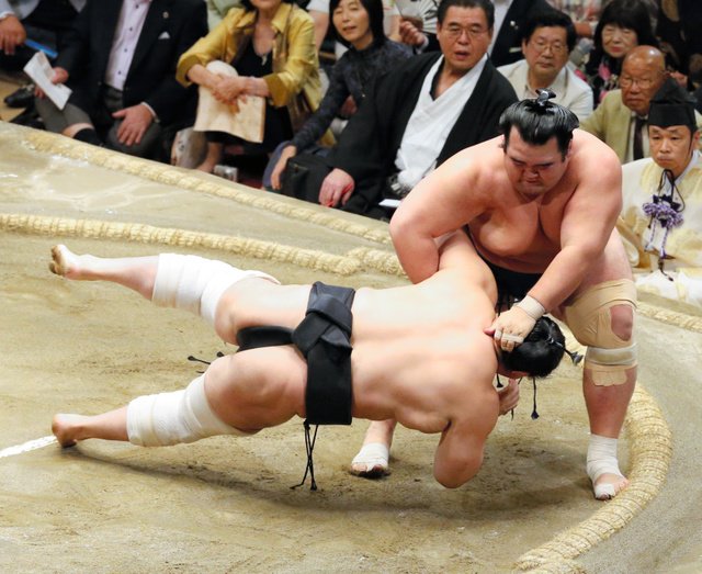 Gôeidô est le seul ôzeki à ne pas être encore kachi koshi et pourrait bien être kadoban dès son premier tournoi depuis qu’il a été promu. Dans un échange de claques avec Takarafuji les deux hommes se sont mutuellement repoussés avant que le maegashira 4 ne parvienne à prendre le dessus.