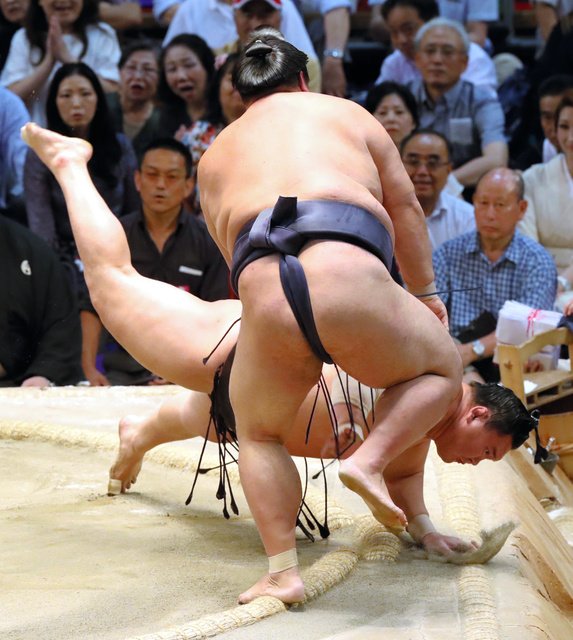 Although outweighed by nearly 20 kilograms, Takanoiwa repeatedly landed blows and kept moving until he had the advantage and was able to drive Takarafuji (9-5) from the ring.