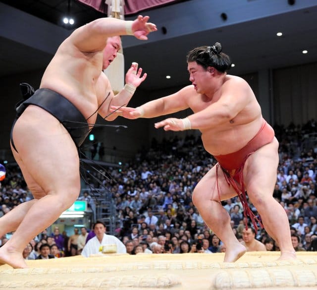 Dans l’avant dernier combat de la journée, Hakuho a été vaincu alors que la veille il avait subi sa première défaite entre les mains de Harumafuji. Dans le face à face qui l’opposait à l’ôzeki Terunofuji, le yokozuna était toujours sur la défensive.
