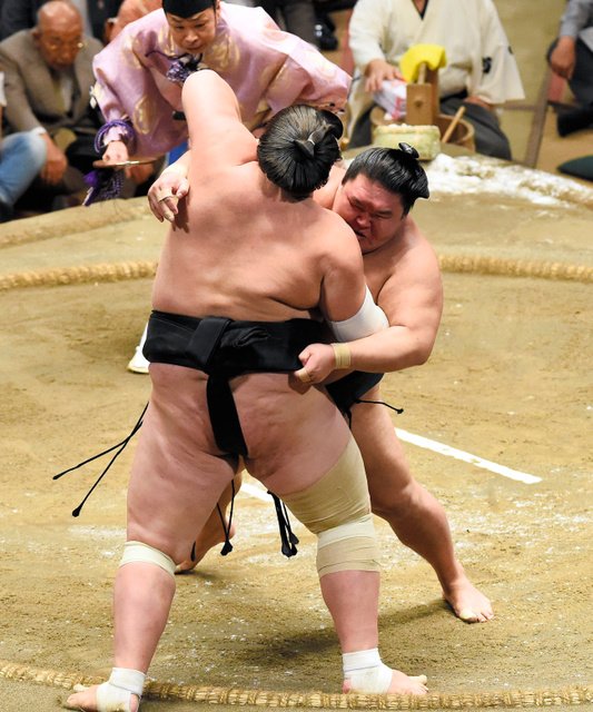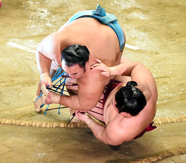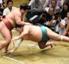 In an all-sekiwake matchup, Myogiryu (8-6) floored ozeki hopeful Tochiozan (8-6) with a kubinage headlock throw, wrecking his hopes of posting double digits for the second meet in a row after his impressive 10-5 showing in Nagoya.