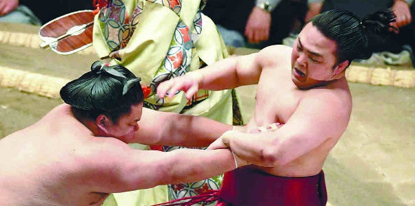 The 33-year-old Tokushoryu continued defying predictions by using a right outside grip to thrust down Shodai (12-2), winner of their only previous meeting. After the pair locked up in the middle of the ring, Shodai took the offensive and drove Tokushoryu backward. But the lower-ranked wrestler kept his cool and was able to pull Shodai off balance and down to the clay, all while backpedaling toward the straw.