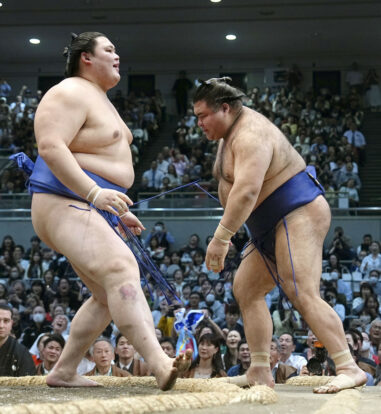 Les maegashira Churanoumi, Aonishiki et Tokihayate, moins bien classés, étaient juste derrière avec une victoire de moins au classement provisoire avant les combats.