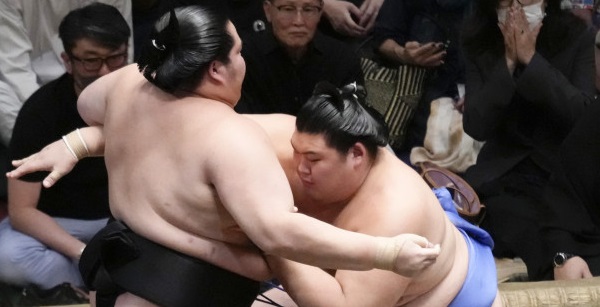 Après être entré dans le dohyô sous une ovation enthousiaste, Onosato, 1,92 mètre et 182 kilos, s’est envolé des lignes de départ mais a été pris au dépourvu par Abi qui s’est déplacé latéralement et l’a poussé vers la terre battue.