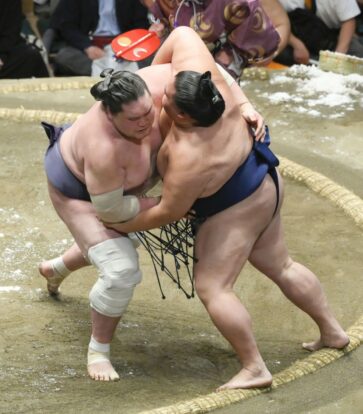 Le komusubi Hoshoryu a terminé à 8-7 après avoir réussi un corps-à-corps contre le maegashira 2 Kiribayama (10-5) mais qu’il n’a pas pu conclure. L’étoile montante de Mongolie a obtenu le kachi-koshi dans ses deux tournois en sany’aku.