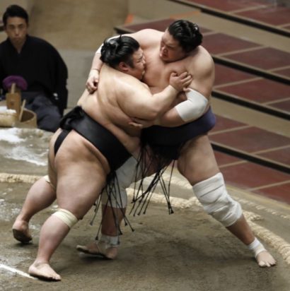 Komusubi Takayasu claimed a winning record at 8-7 by forcing out No. 6 Tamawashi (8-7). The former ozeki got a firm hold of Tamawashi’s belt at the jump and drove him straight out.