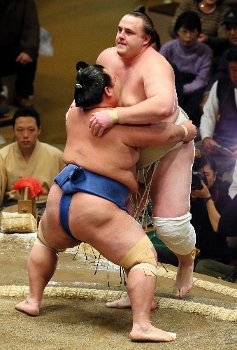 Après, je ne sais pas si c’est le froid qui a engourdi nos lutteurs ou bien comme la journée était chômée ils n’ont pas voulu se donner à 100% mais il aura fallu attendre presque l’arrivé des ôzeki pour avoir droit à de beaux combats. Le komusubi Tochiozan inflige la première défaite à un ôzeki : Kakuryu. L’autre komusubi Shohozan ne parvient toujours pas a décrocher de victoire pour le moment. Le sekiwake Baruto s’est fait expulser par le bulldozer Kotoshogiku et les yokozuna continue sur un sans faute.