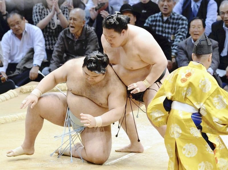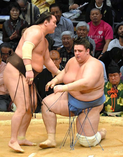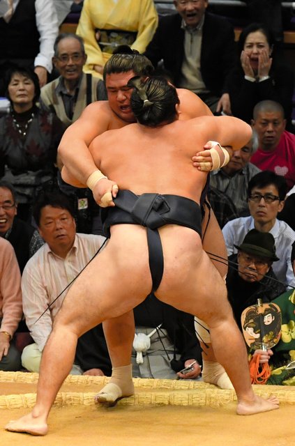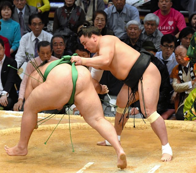 Local favorite Kotoshogiku suffered his first defeat, a weak charge allowing Mitakeumi to push the Fukuoka native ozeki toward the edge before executing his under-shoulder wing down to perfection, getting his first win in the fourth-highest rank of komusubi.