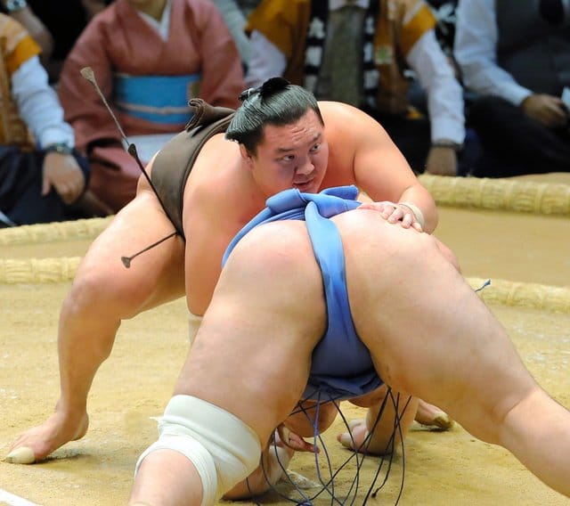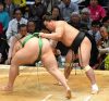 L’enfant du pays Kotoshogiku a subi sa première défaite après une charge faible contre Mitakeumi. L’ôzeki, natif de Fukuoka, a été conduit vers le bord de l’anneau avant que le jeune nouveau komusubi ne termine le travail.