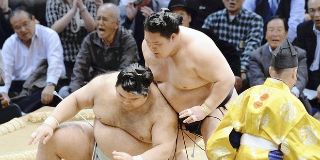 Local favorite Kotoshogiku suffered his first defeat, a weak charge allowing Mitakeumi to push the Fukuoka native ozeki toward the edge before executing his under-shoulder wing down to perfection, getting his first win in the fourth-highest rank of komusubi.