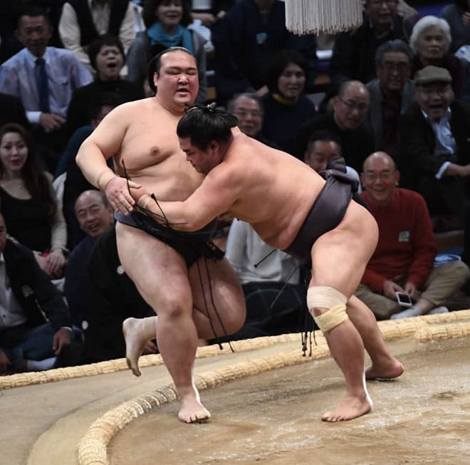 Myogiryu kept his opponent upright throughout the bout and eventually forced the grand champion backwards out of the ring before Kisenosato crashed to the ground.