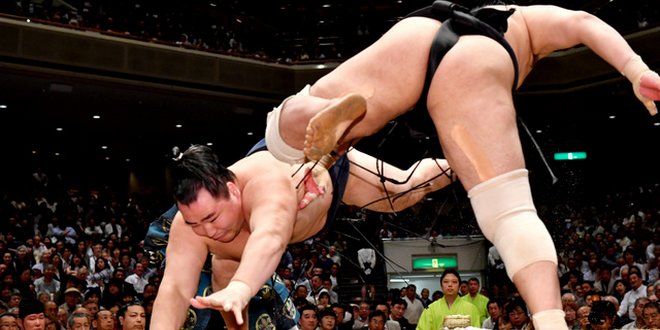 The other two yokozuna, Hakuho and Harumafuji, each rolled to their second win in as many days. Hakuho seized a slap-fest against Yoshikaze (1-1), while Harumafuji bulldozed top-ranked Endo (1-1) off the mound with authority.
