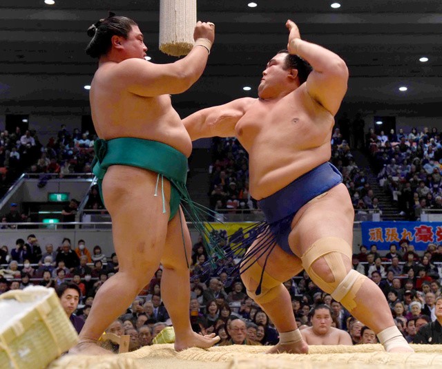 Terunofuji, who along with Goeido, needs eight wins in Osaka to retain his ozeki ranking, defeated Bulgarian behemoth Aoiyama (1-1) but was forced to work overtime. With Aoiyama noncommittal to attack, it took a patient approach from Mongolian Terunofuji (2-0) to maneuver the No. 3 maegashira to the edge of the ring, forcing him out.