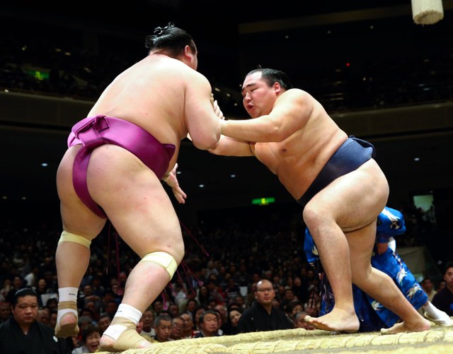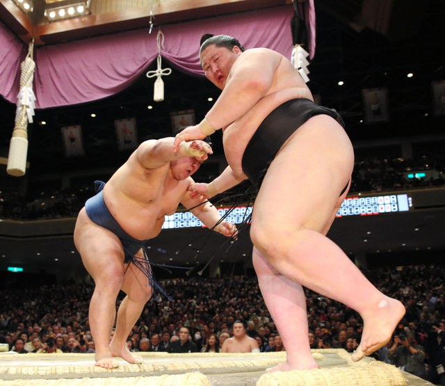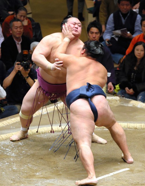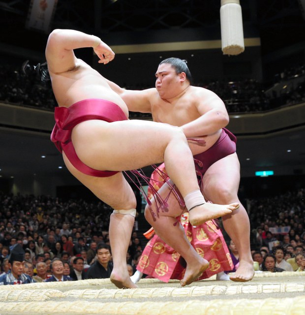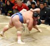 Harumafuji, looking to add to his Kyushu basho title in November, was overturned at the edge of the ring. The Mongolian barged into his counterpart after the initial crash, but Shohozan, who was 12-3 in his native Fukuoka in November, was able to pivot and floor the yokozuna with a beltless arm throw.