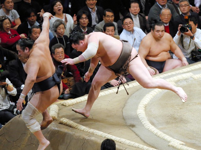 Record title holder Hakuho (2-0), who survived a scare on the opening day against komusubi Ikioi, easily dispatched No. 1 maegashira Aminishiki (1-1). The 37-year-old veteran got the better of ozeki Kisenosato on Sunday, but was asking for trouble when he failed to slap down the yokozuna and easily was backed out the ring in seconds.