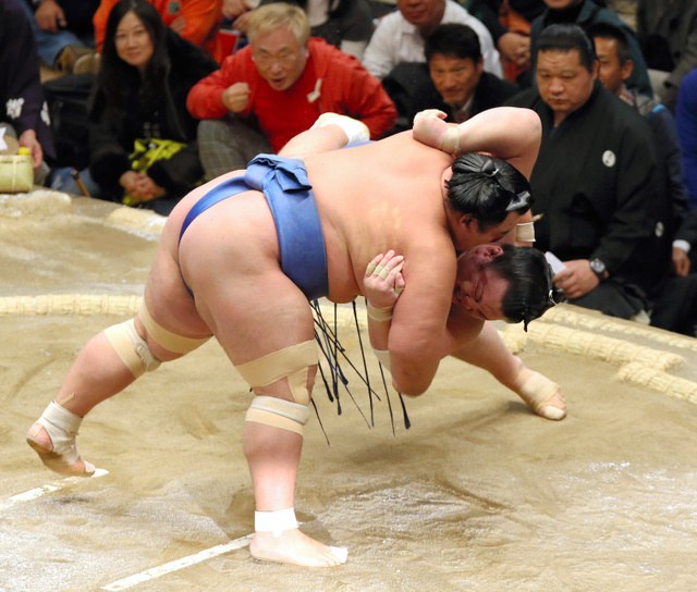All three Japanese ozeki looked solid on the day. Kotoshogiku (2-0) slapped the face of komusubi Ikioi (0-2) off tachiai to put his left arm around before executing a beltless arm throw, while Goeido (2-0), nursing his sore right wrist, slammed in low against Ichinojo (0-2) and pushed the Mongolian No. 3 maegashira straight off the ring.