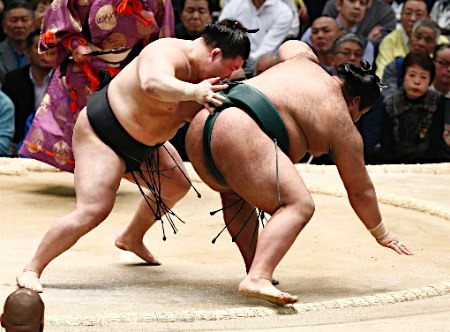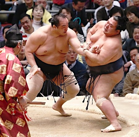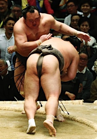 The big question mark was Mr. Inconsistent, ozeki Kisenosato, who was easily pummeled to a second straight defeat at the hands of Myogiryu (1-1).