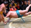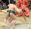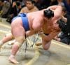 Meilleur démarrage pour l’autre sekiwake Aoiyama qui en battant Endô continue sur un parcours sans faute.