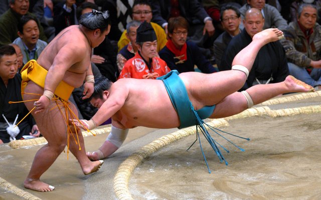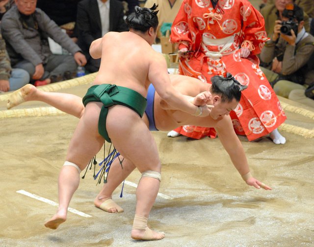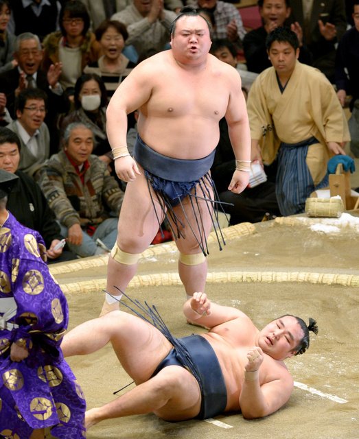 Yokozuna Hakuho eased through his second match at the New Year Grand Sumo Tournament on Jan. 12 and got an added bonus–in the final bout of the day, compatriot and rival Kakuryu hit the deck in a very unexpected upset to rank-and-filer Takarafuji.